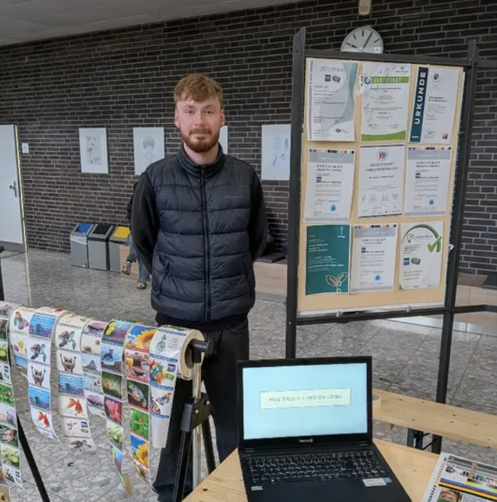 Im Rahmen einer Hausmesse hat unsere Unterstufe der angehenden Medientechnolog*innen Druck-, Siebdruck- und Druckverarbeitung ihre Betriebe und Produkte präsentiert. Interessierte Besucher*innen anderer Bildungsgänge konnten sich über Technologien der Druckindustrie und die jeweiligen Berufe informieren.