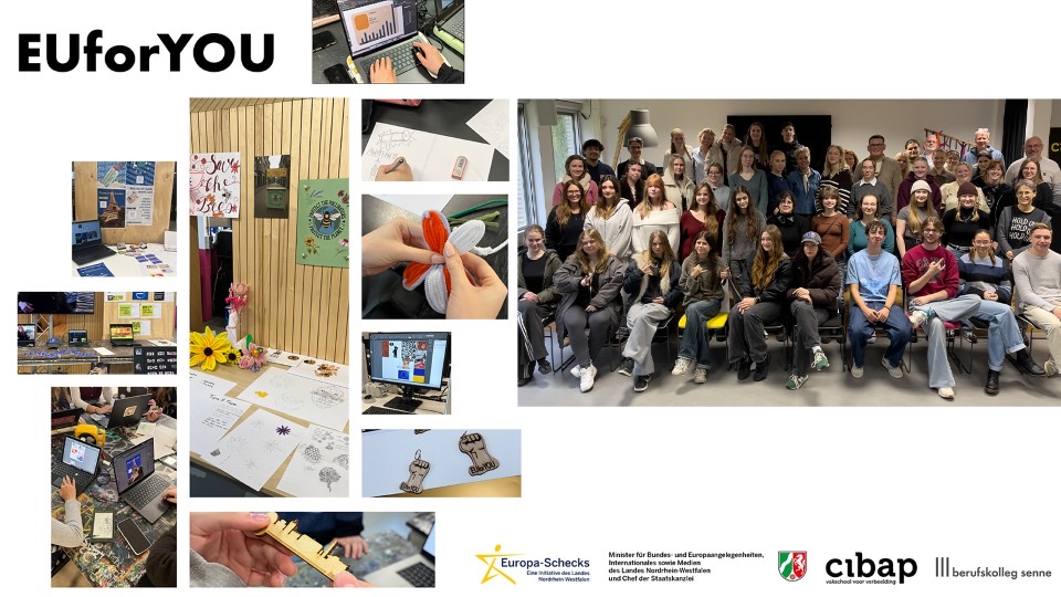 Unsere Gestaltungstechnischen Assistent*innen der Fachrichtungen Grafik- und Objektdesign besuchten im November das Cibap Designkolleg in Zwolle (NL) und erarbeiteten dort mit niederländischen Auszubildenden Konzepte und Kampagnen um Jugendlichen Themen rund um Europa näher zu bringen. Sie beschäftigten sich dabei mit Themen wie Freizügigkeit, Sicherheit, Klimaschutz, Verbraucherschutz und internationaler Begegnung. Die Ergebnisse der Arbeit vor Ort können ab sofort in einer kleinen Ausstellung im Foyer des BK Senne besichtigt werden.